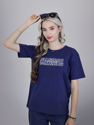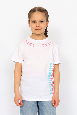 Футболка со спущенным плечом и короткими рукавами. Спереди карман декорирован ришелье. Горловина круглая, обработана притачной бейкой. По ростку горловины шов притачивания закрыт долевиком.