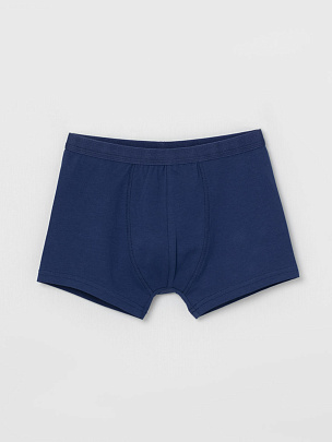 Трусы-боксеры из набивного полотна. Верхние и нижние срезы обработаны плоским швом вподгибку. По верху одновременно проложена резинка. Швы притачивания вставки и ластовицы спереди оформлены декоративной строчкой с застилом в цвет полотна. Посередине верхнего края переда настрочена декоративная этикетка.
