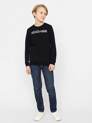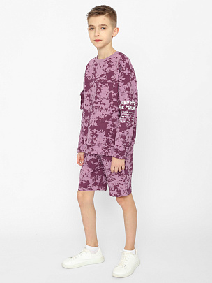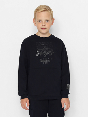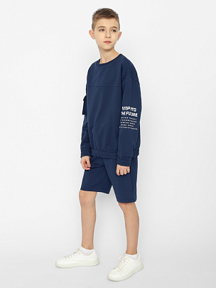 Джемпер для мальчика с длинными рукавами и притачным поясом. Воротник, манжеты и пояс выполнены из полотна с эластаном. Перед и спинка джемпера со вставками контрастного цвета. Вставки декорированы принтами. На пояс спереди настрочена декоративная жаккардовая этикетка.