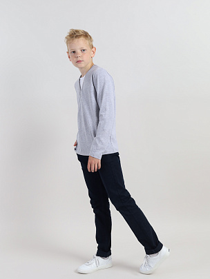 Джемпер с длинным втачным рукавом. Воротник с вырезом и имитацией футболки, по краю ланки воротника расположены декоративные пуговицы.