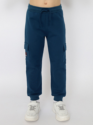 Брюки для мальчика с накладными карманами с клапаном. Нижние срезы брюк оформлены притачными манжетами из полотна с эластаном. Пояс притачной, с резинкой и функциональным шнуром. На карман настрочена декоративная жаккардовая этикетка.
