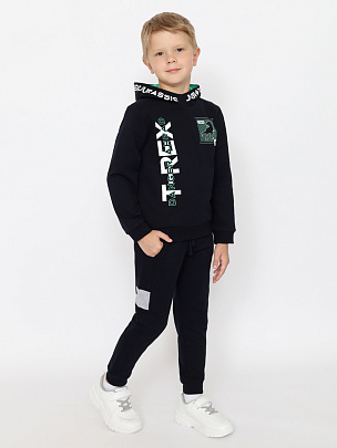 Толстовка с длинными рукавами, притачным поясом и манжетами. Манжеты и пояс выполненя из полотна с добавлением эластана. Капюшон с притачной планкой и подкладкой контрастного цвета, планка декорирована принтом. Перед декорирован принтом "тираннозавр Рекс".