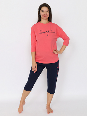 Комплект из гладкокрашенной майки и набивных трусов. Майка с плечом. Горловина и проймы обработаны окантовкой из основного полотна. Перед оформлен шелкографией. Верх трусов обработан плоским швом вподгибку с одновременным прокладыванием резинки. Проймы ножек обработаны окантовкой из основного полотна.