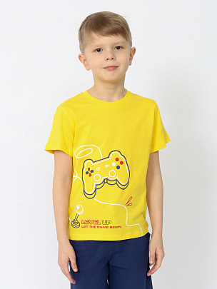 Футболка с коротким рукавом. Горловина круглая, обработана узким воротником из полотна с эластаном. Перед оформлен принтом.