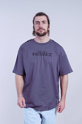 Футболка oversize со спущенным плечом, с коротким рукавом. Горловина круглая, обработана притачной бейкой из рибаны с лакрой. Плечевые швы смещены на перед и отстрочены. По переду вдоль правого бокового шва - текстовый принт.