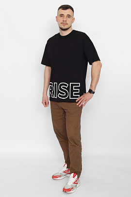 Футболка oversize со спущенным плечом, с коротким рукавом. Горловина круглая, обработана притачной бейкой из рибаны с лакрой. Плечевые швы смещены на перед и отстрочены. Перед оформлен принтом.